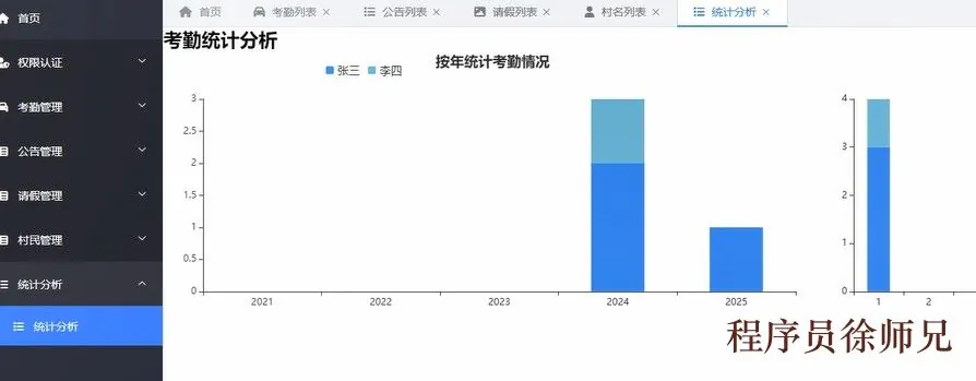签到考勤统计:按年,月进行柱状图统计,一目了然地看出关键信息。