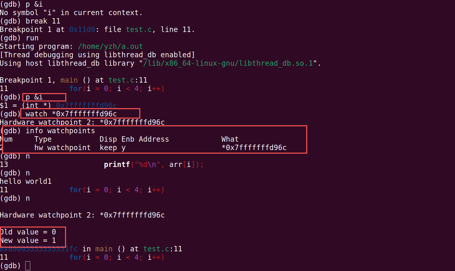 设置观察点,当观察点地址里面的值发生变化的的时候会打印出来。
