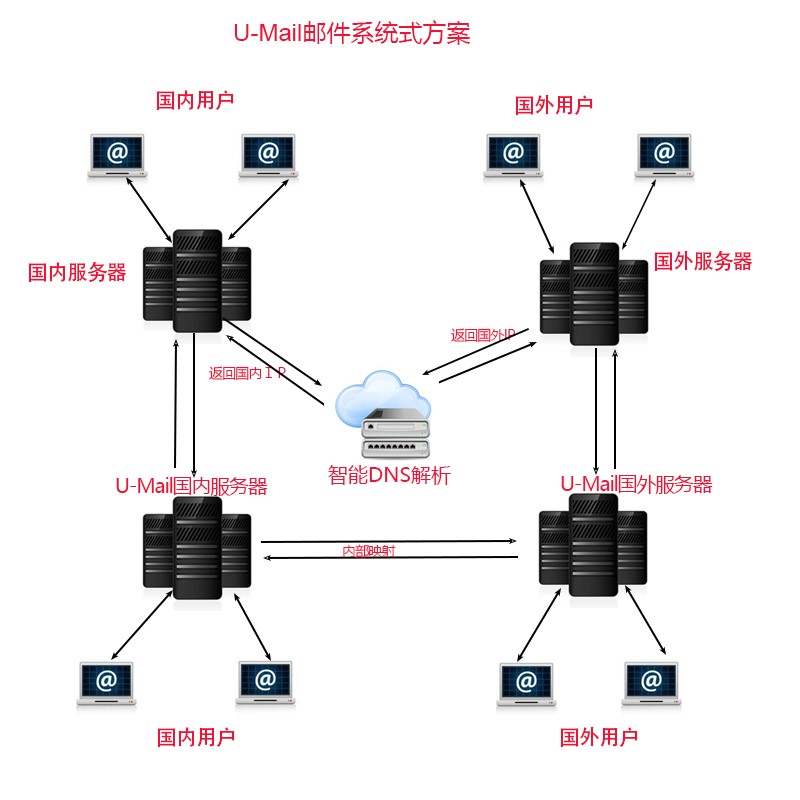 某跨国公司在国外均设置有办事处,海外工作人员在访问公司邮箱收发邮件时候,常常遇到链接不到国内邮件服务器、或者访问不稳定问题,从而影响公司办公效率。公司找到国内邮件系统厂商U-Mail定制企业邮件系统部署方案: