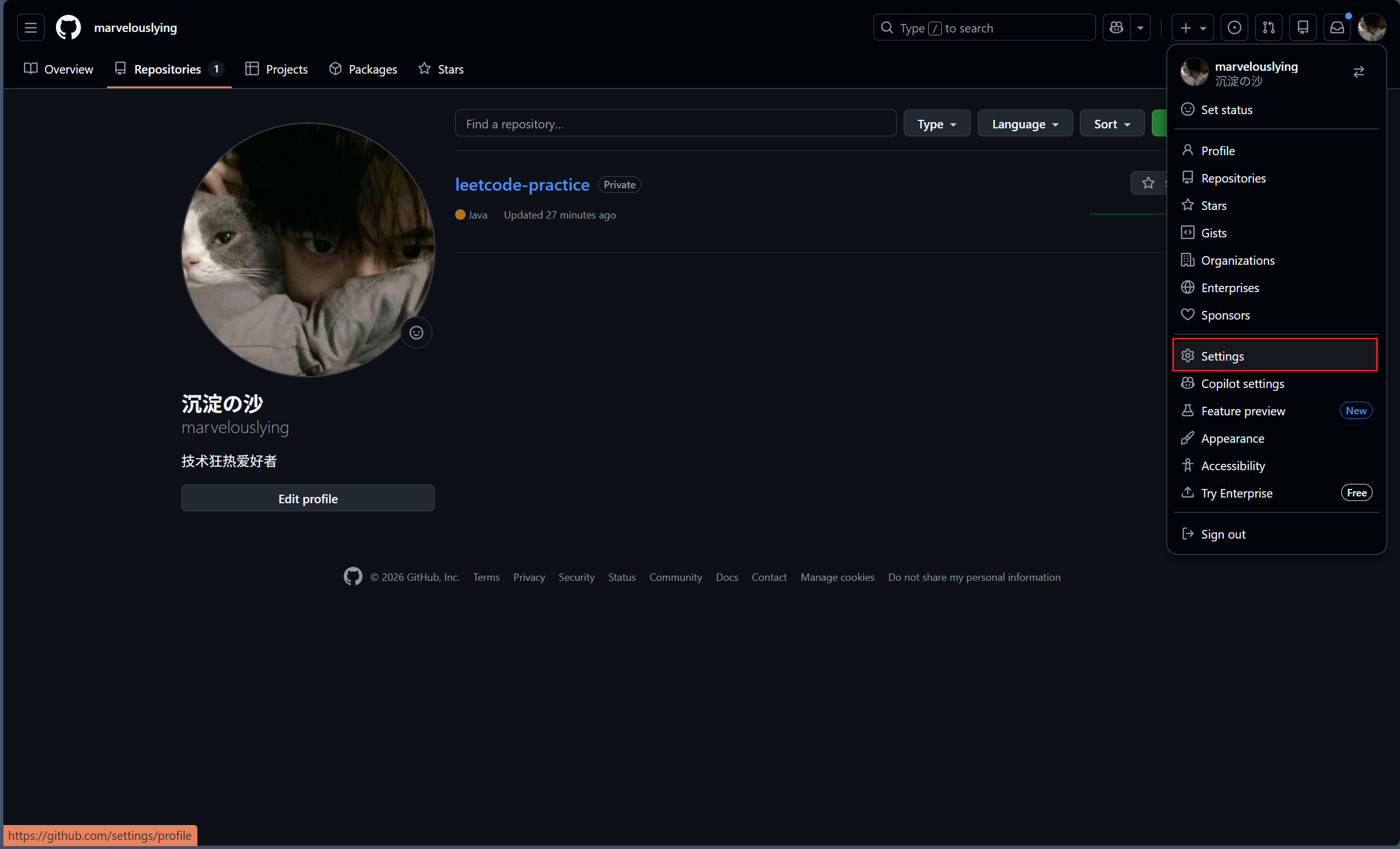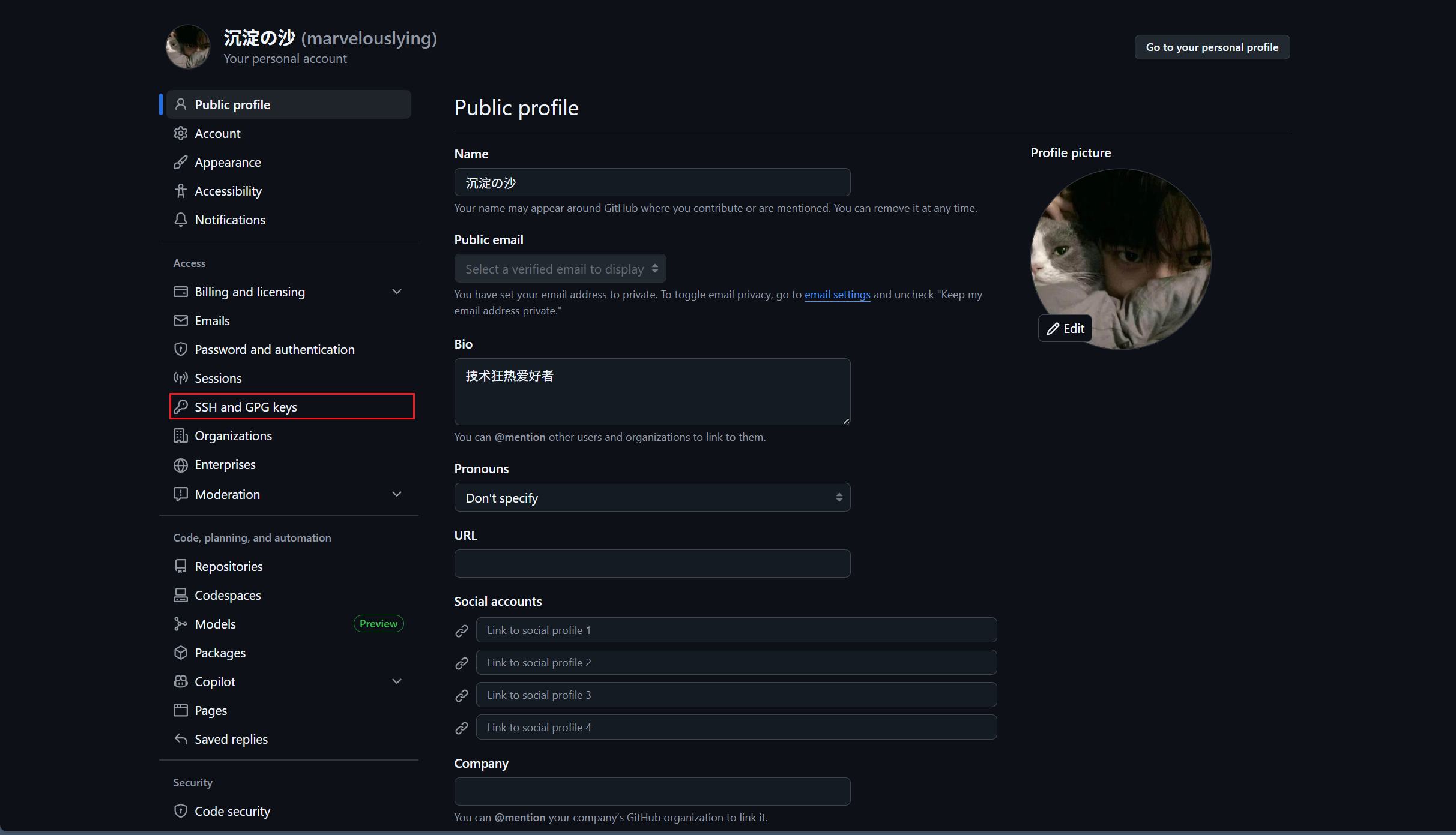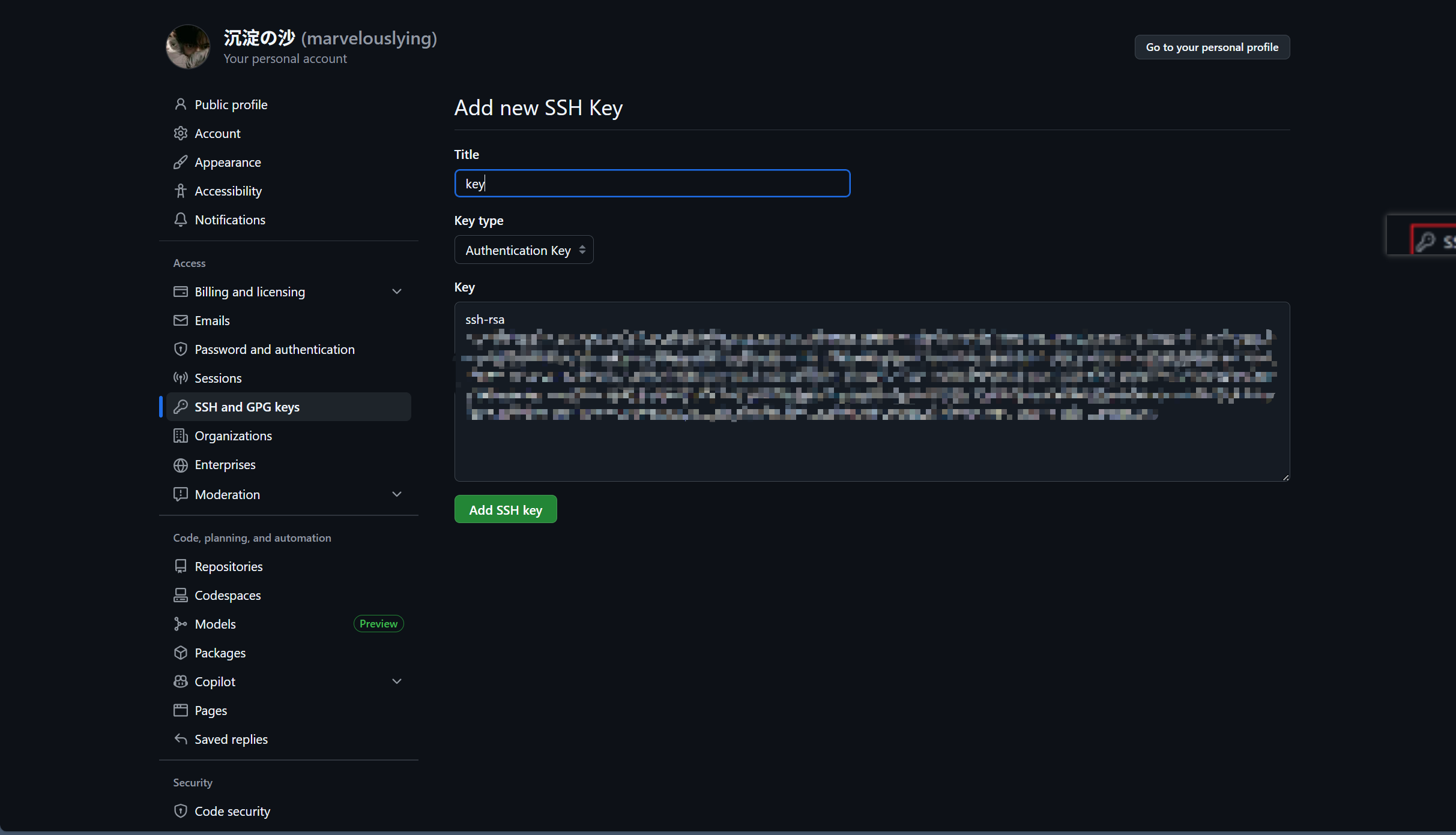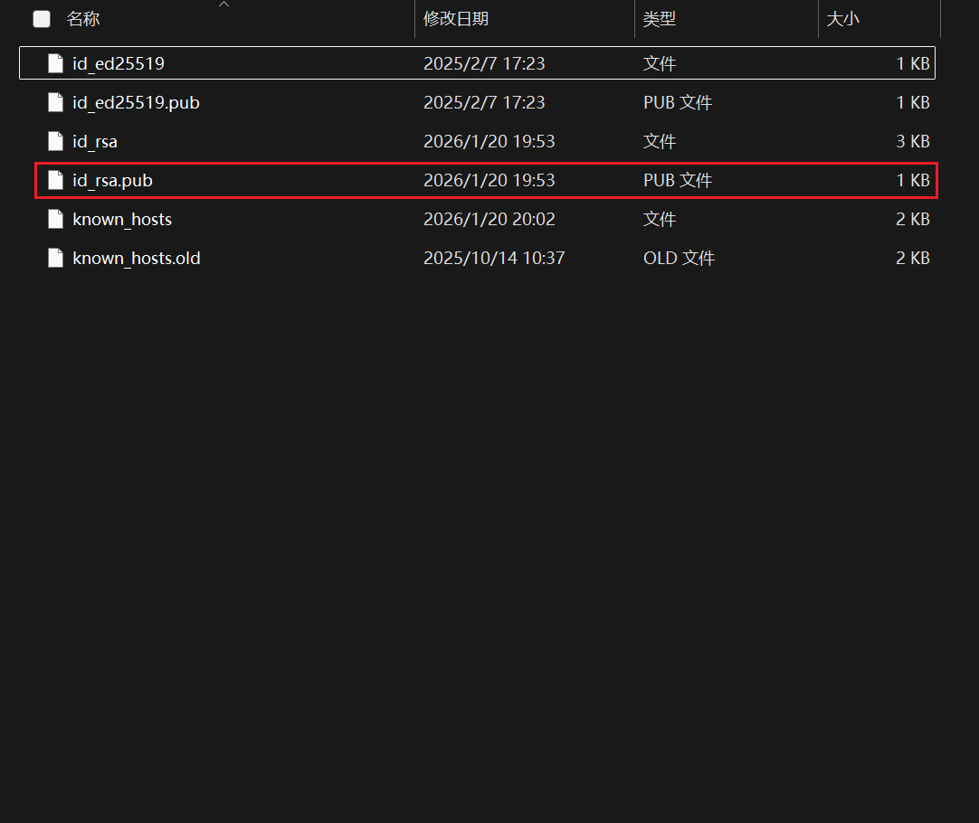 找到上方红框中的文件(后缀是.pub),打开并将里面的完整内容复制粘贴到GitHub的""settings"的"SSH and GPG keys"当中