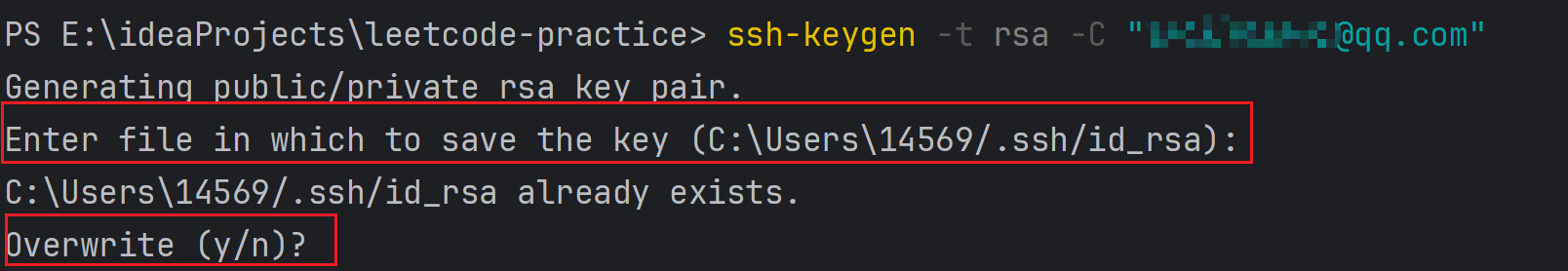 因此在IDEA的终端中输入该指令"ssh-keygen -t rsa -C "youremail@example.com",以获取公钥(引号中的内容随意输入)。