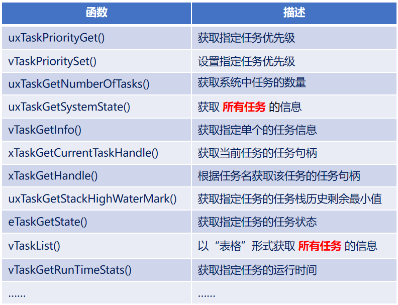 除了前面讲解的核心任务相关函数,其实 FreeRTOS 还有很多与任务相关的 API 函数,不过这些 API 函数大多都是辅助函数: