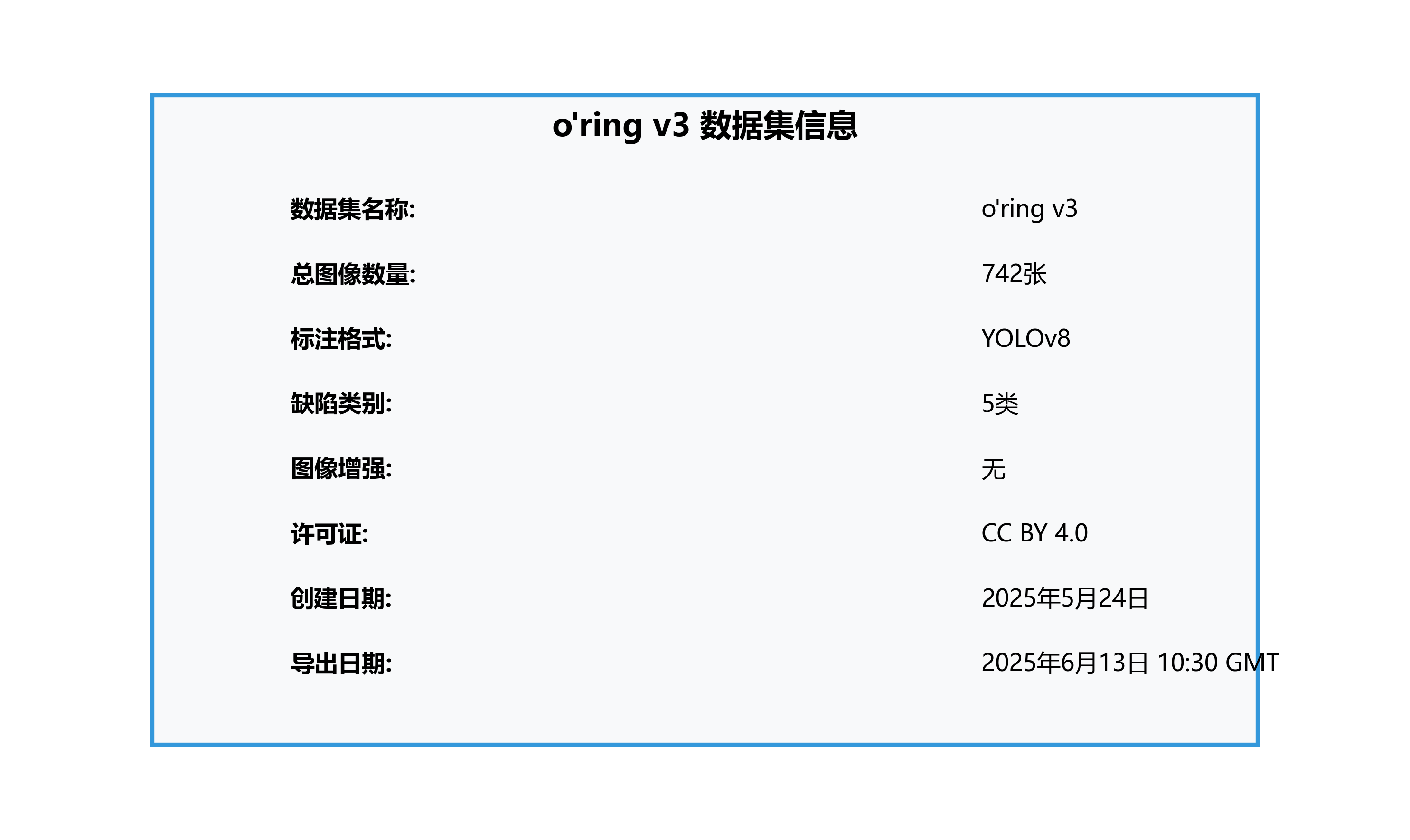 本数据集名为o'ring,版本为v3,于2025年5月24日创建,并通过qunshankj平台于2025年6月13日10:30 GMT导出。该数据集专注于橡胶密封圈表面缺陷的检测与识别,包含742张图像,所有标注均采用YOLOv8格式。数据集未应用任何图像增强技术,保持了原始图像的完整性。数据集分为训练集、验证集和测试集三部分,共有5类缺陷,分别为'cut'(切割缺陷)、'overpressed'(过度压制)、'rough'(表面粗糙)、'smooth'(表面光滑异常)和'springi'(弹簧相关缺陷)。此数据集采用CC BY 4.0许可证授权,由qunshankj用户提供,可用于计算机视觉模型的训练、测试和部署,为橡胶密封圈质量控制提供自动化检测方案。