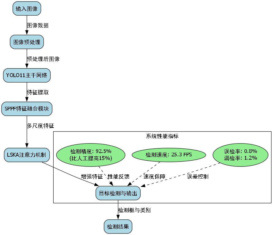 系统架构图展示了我们提出的检测方案的整体框架,包括图像采集、预处理、缺陷检测和结果输出四个主要模块。其中,核心的缺陷检测模块采用了改进的YOLO11网络结构,引入SPPF和LSKA两种创新模块,显著提升了模型对小尺寸缺陷的检测能力。