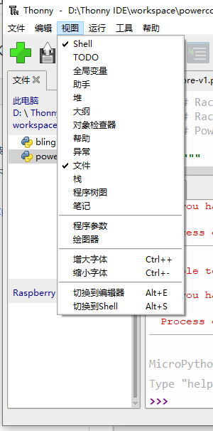 转到thonny的普通模式或者一般模式或者标准模式, 就有菜单了,view里展示文件 当连接到pico后,文件会有分两块,上面是电脑,下面是pico