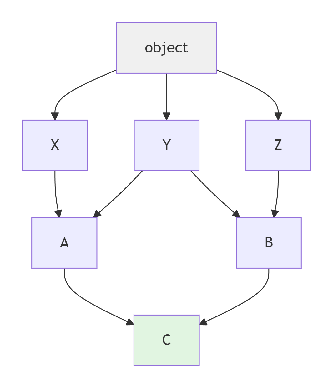 class A(X, Y): passclass B(Y, Z): passclass C(A, B): pass