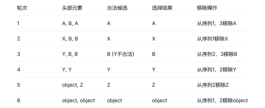 第1轮:取出 A 序列更新为 [Y, Z, object],[B, Z, Y, object],[B]第2轮:取出 B 序列更新为 [Y, Z, object],[Z, Y, object],[]第3轮: 现在查看头部: - 序列1头部:Y - 序列2头部:Z