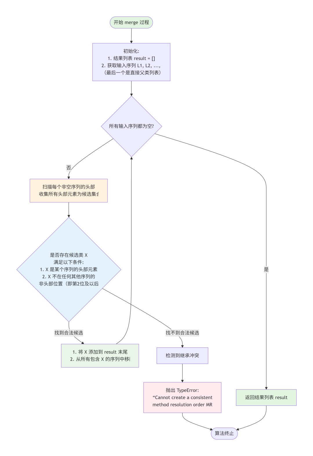 MRO(C) = [C] + merge( MRO(P1), # 第一个直接父类的 MRO MRO(P2), # 第二个直接父类的 MRO ..., [P1, P2, ...] # 直接父类列表)