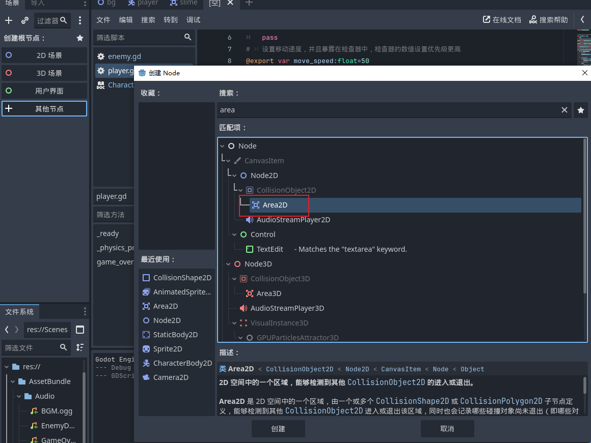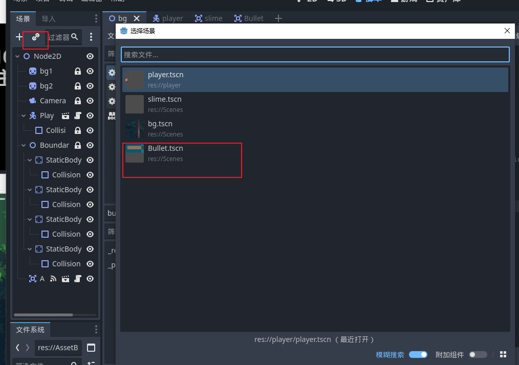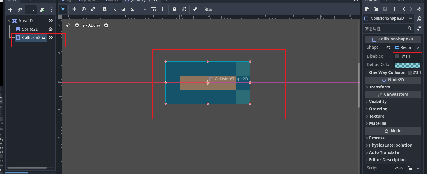 - 子弹场景的根节点也是选择area2d,因为我们需要判断子弹是否撞到了史莱姆