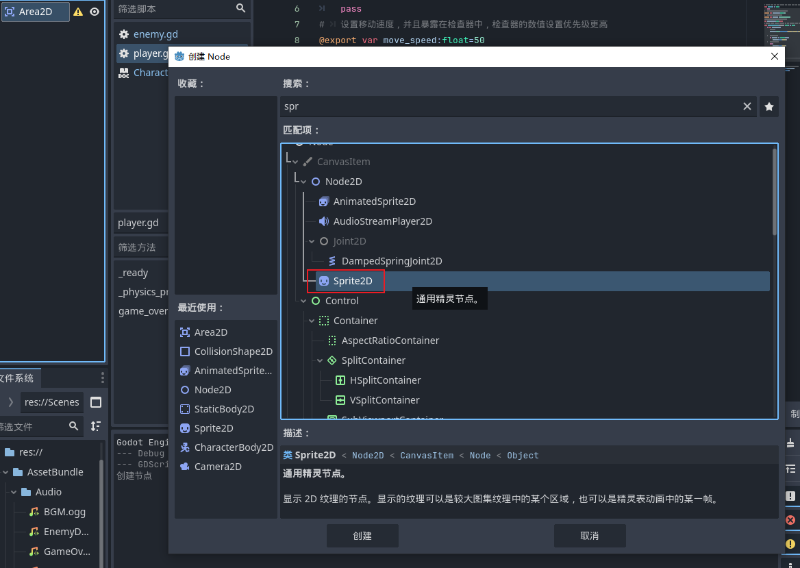 - 然后我们需要给子弹添加图片,因为子弹没有动画,所以我们这里添加sprite2d就可以了(但是如果说你想给玩家的子弹弄得多彩一些就可以考虑加上一下动画使用那个Animatedsprite2D精灵动画节点)
