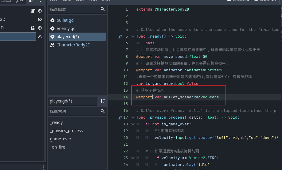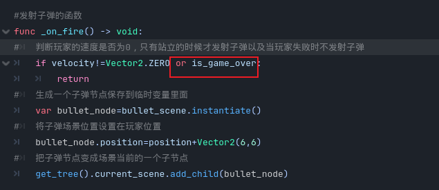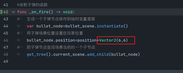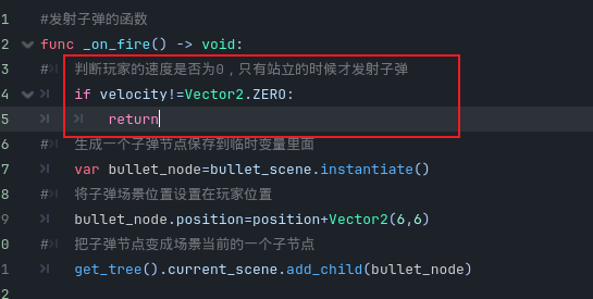 - 然后我们需要编写一下这个发射子弹的函数,先生成一个子弹节点保存到临时变量里面,然后将子弹场景位置设置在玩家位置,最后把子弹节点变成场景当前的一个子节点