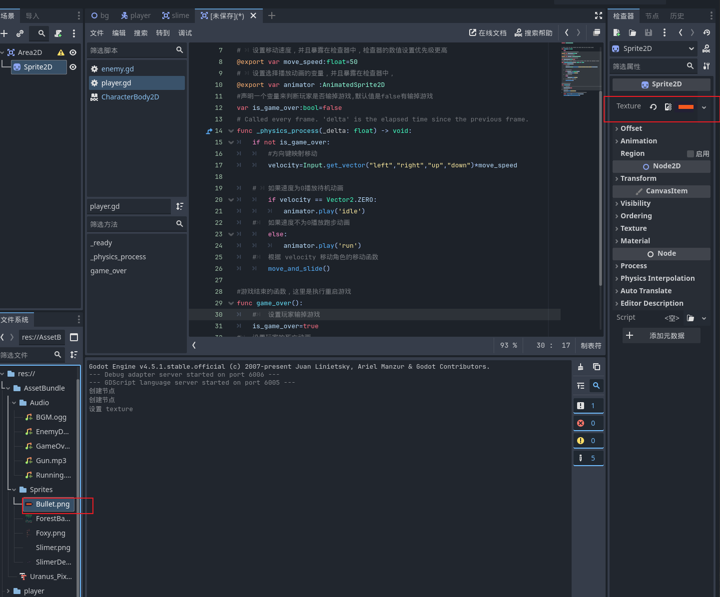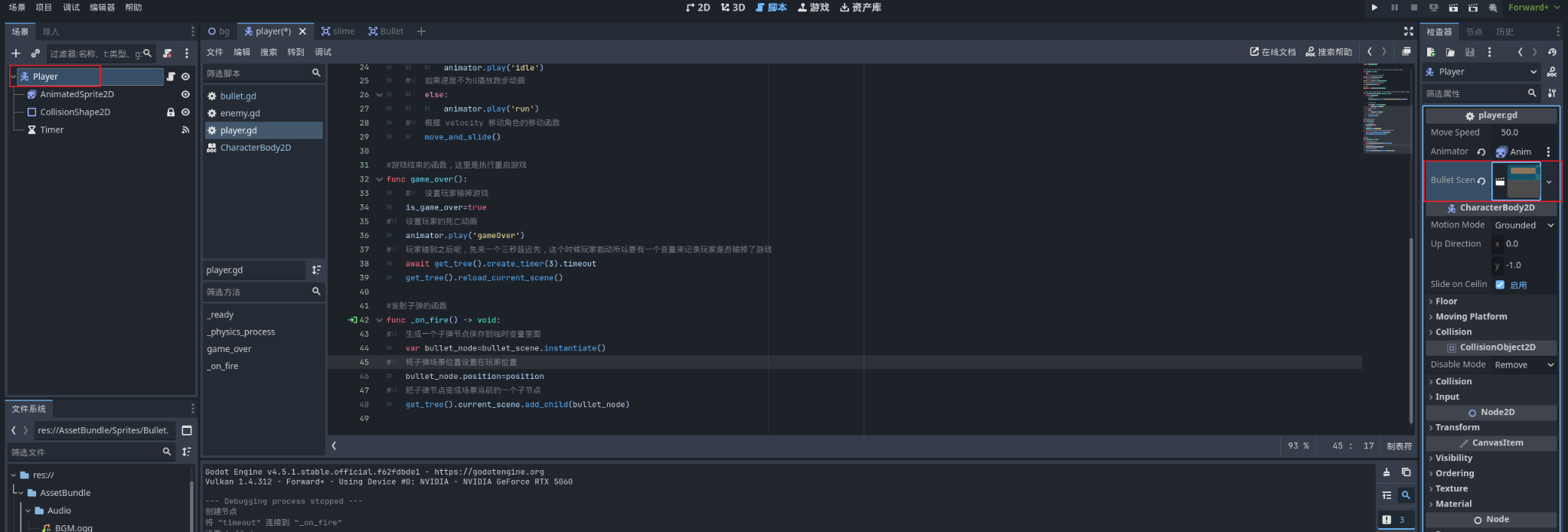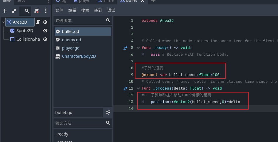 Area2D 作为根节点,用于检测子弹与敌人的碰撞;添加 Sprite2D 显示子弹图片,并配置 CollisionShape2D(矩形)作为碰撞体,调整大小与位置后保存为 Bullet 场景。随后在子弹根节点编写脚本,定义可在检查器中调整的速度变量,使子弹以固定速度持续向指定方向移动。 -