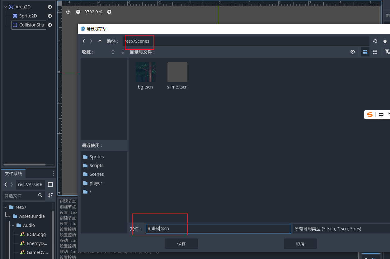 - 然后保存这个场景到scense文件夹中,起名为Bullet