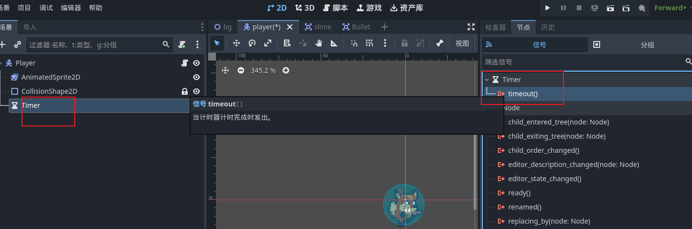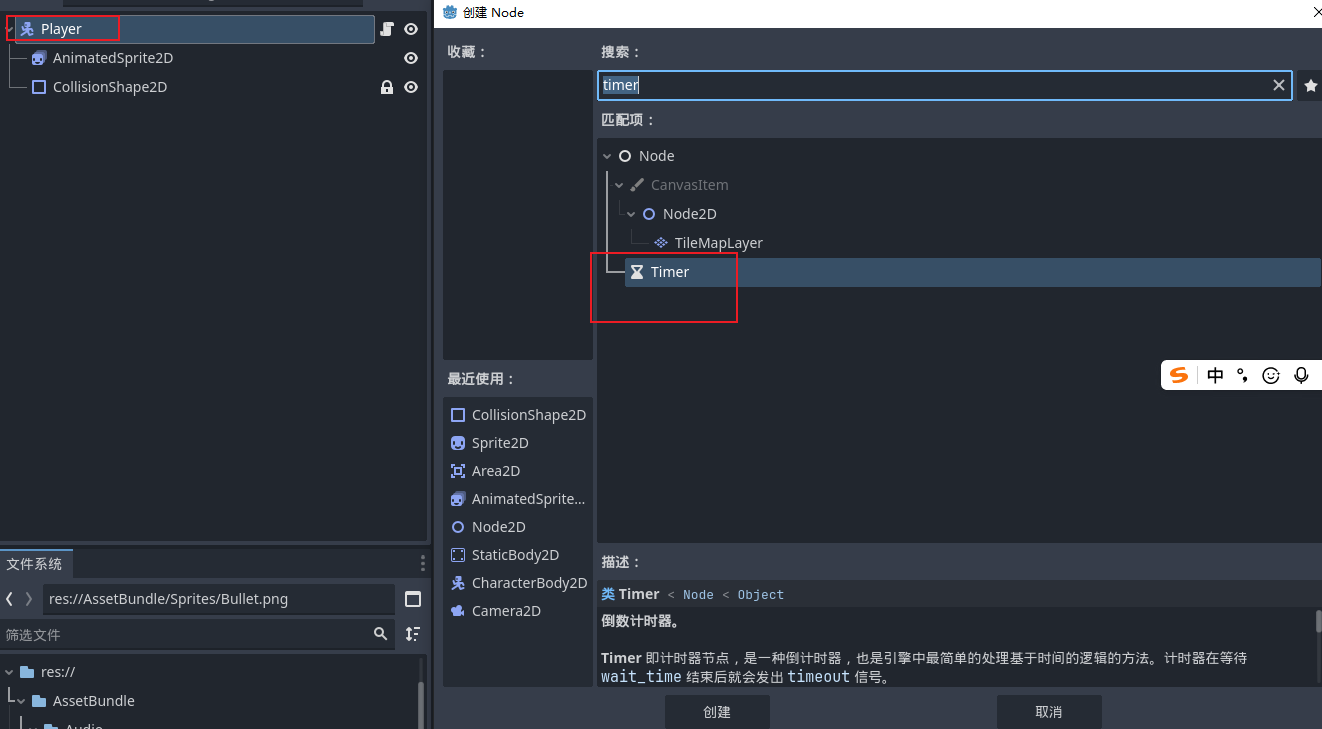 - 让玩家角色根据倒计时每秒都进行自动释放子弹,在玩家场景添加一个新的时间节点,timer