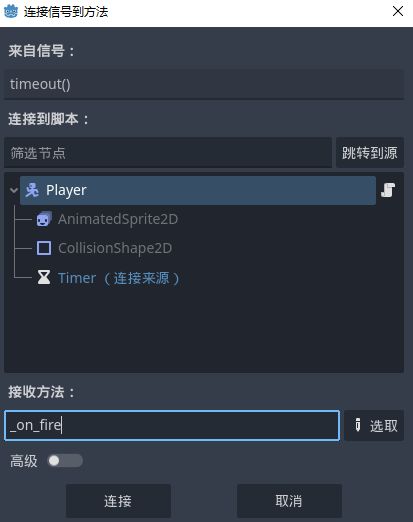 - 我们双击这个信号,将其链接到玩家场景的脚本代码上