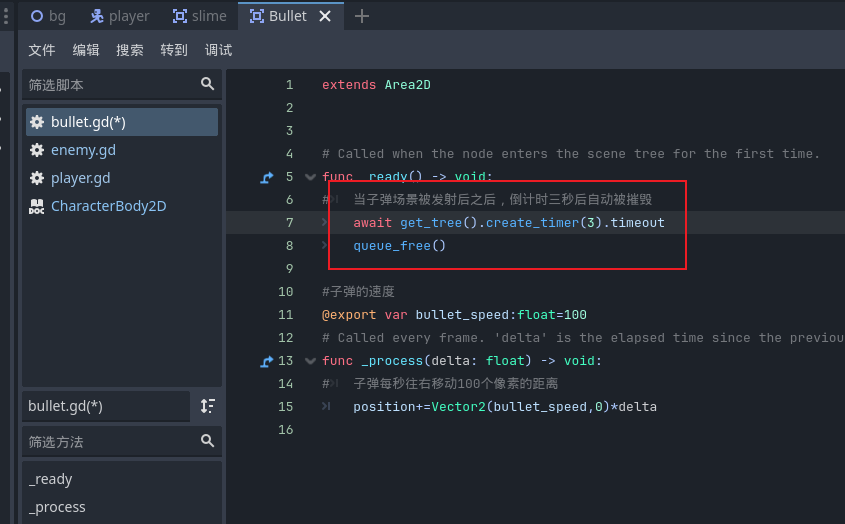- 然后我们在发射子弹的时候会生成很多很多的子弹场景,所以我们还需要来一个定时摧毁,我们在ready函数里面加入一个倒计时,倒计时到了之后就摧毁这个子弹场景