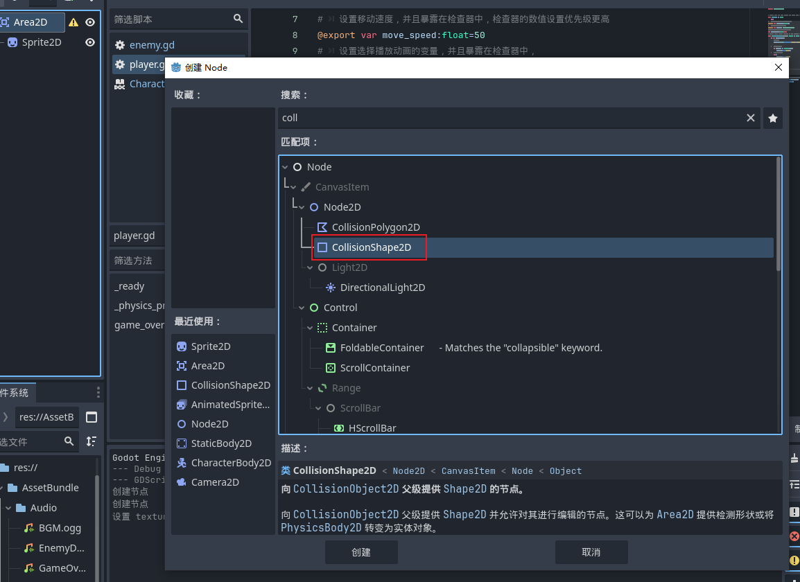 - 然后给子弹加上物理形态就是Collisionshape2D节点进行参与碰撞