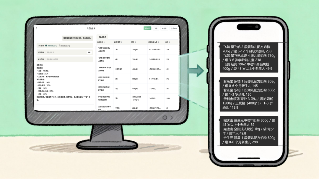 微信消息截图成表:零散的聊天记录、随手的截图,上传即可自动识别商品、价格、规格,生成标准的产品信息表。