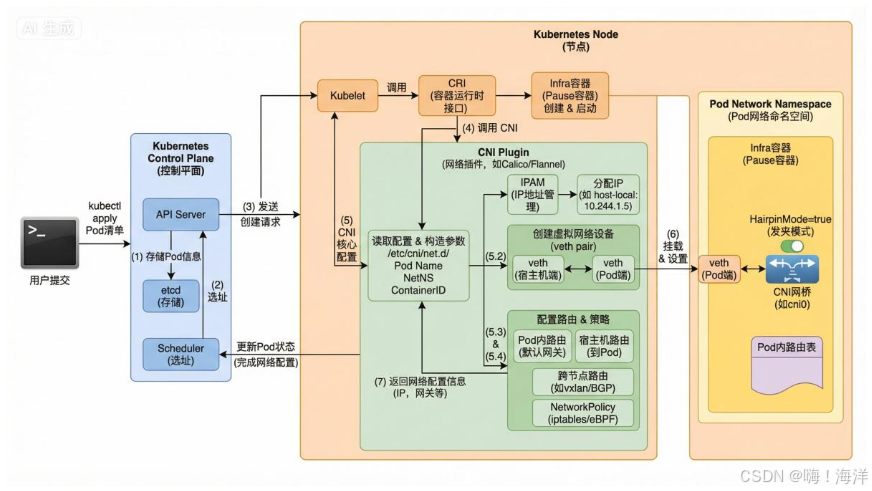 (5)CNI插件(依据/etc/cni/net.d)完成IP分配 + 设备创建 + 路由设置
