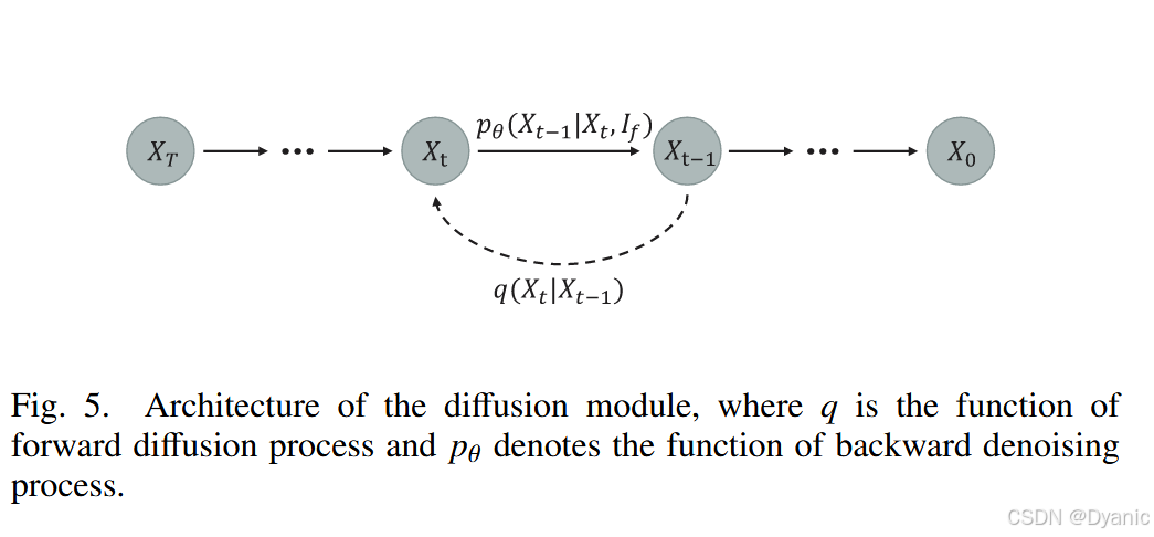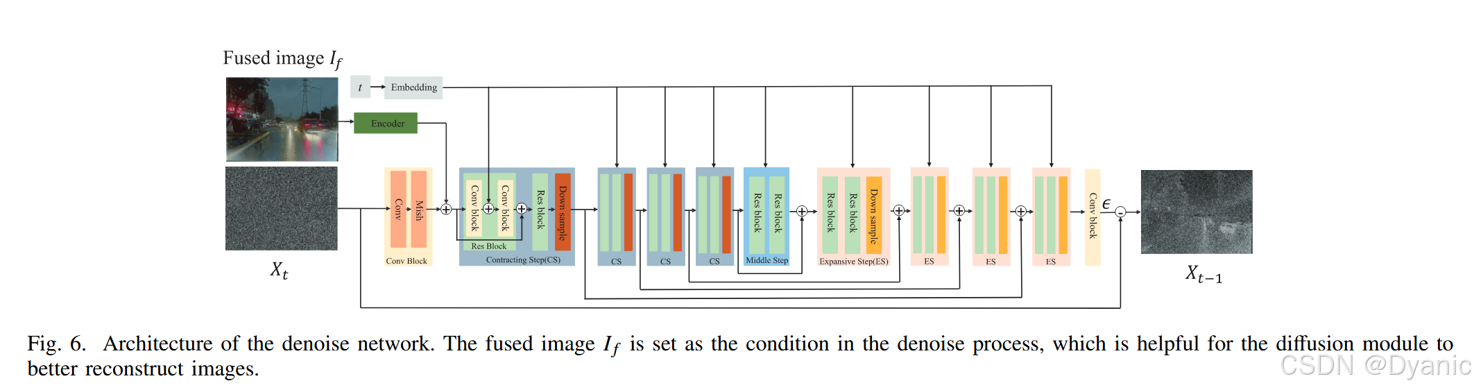 我们采用 U-Net 结构作为去噪网络,用于预测每一步的噪声,并使用两个卷积层对融合图像 IfI_fIf 进行编码。如图 5 所示,第 i−1i-1i−1 步的噪声通过第 iii 步的噪声和融合图像作为条件进行近似。基于融合图像条件 IfI_fIf 的反向过程可表示为: