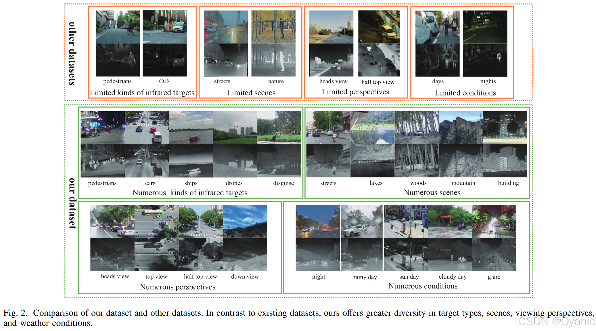 最后,可见光与红外图像中还存在冲突信息。当同一目标在红外图像和可见光图像中的特征呈现出强烈对比或差异时,我们将其称为冲突信息。如图 1 所示的白天场景中,黑色汽车比白色汽车更容易吸收热量,因此在红外图像中黑色汽车往往具有比白色汽车更高的像素强度,而在可见光图像中情况正好相反。类似地,平坦道路在热成像图像中也具有复杂的热分布。可以看出,现有方法在融合这类冲突信息时表现较差。与此同时,如图 2 所示,当前红外与可见光图像融合的数据集包含的红外目标种类有限,场景和视角相对单一,主要为夜间或白天低温条件下的街景正视图。然而,真实世界的场景要比数据集中的情况复杂得多。例如,在几乎所有数据集中,行人的温度显著高于背景,使其在红外图像中更加突出;而在实际场景中,如温暖的白天,路面的温度可能高于行人,从而使行人在这些条件下并不显著。模型训练过程中缺乏多场景数据可能会引入偏置。