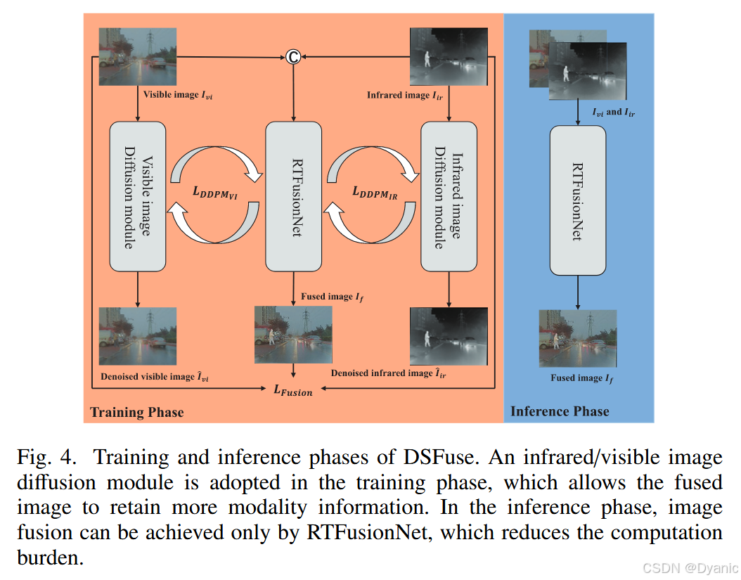 尽管红外与可见光图像来自不同模态,但二者之间仍存在一定程度的信息冗余。我们认为,通过寻找合适的融合过程 FFF,可以在去除大部分冗余信息的同时保留各模态中的关键信息,从而获得理想的融合图像。在该理想融合图像的基础上,可以进一步找到 Rir/viR_{ir/vi}Rir/vi 并重建原始图像。基于上述理论,我们提出了一种基于双扩散结构的融合方法。融合模块 RTFusionNet 负责生成融合图像,红外/可见光扩散模块从噪声中重建源图像,对应于 Rir/viR_{ir/vi}Rir/vi。在训练过程中,来自扩散模块的反馈迫使融合网络聚合模态信息以保证高保真度;同时,高质量的融合图像也有利于扩散模块获得更好的重建效果。最终,我们可以实现式 (1)--(3),并获得理想的融合图像。根据上述分析,如果能够从融合图像中重建源图像,则可以认为该融合图像包含了源图像中的全部必要信息,即冲突信息得到了有效处理。