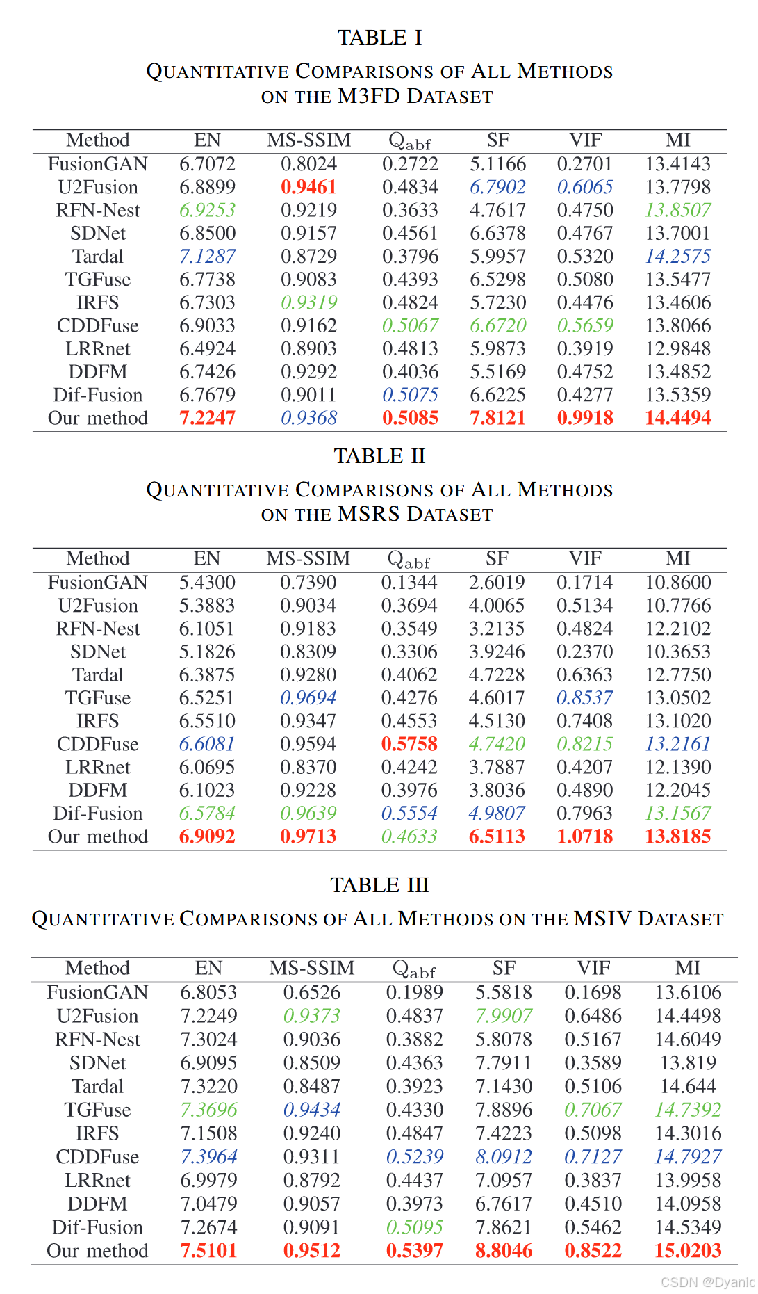 我们在测试图像上使用 6 个客观指标对 11 种 SOTA 方法与 DSFuse 进行了定量评估。结果如图 10 所示,并汇总于表 I--IV。这些表给出了不同方法在不同数据集上的客观指标均值。我们用红色加粗标注最优结果,用蓝色斜体标注第二优结果,用绿色斜体标注第三优结果。表 I 与图 10(a) 给出了 M3FD 数据集的对比结果。可以看到,DSFuse 在 M3FD 数据集的 100 对图像上,在 5 个指标上取得最佳表现。此外,如表 II--IV 与图 10 所示,我们的方法在其他数据集上同样在 5 个指标上表现最佳。EN、SF、MI 和 VIF 的最佳值表明我们的方法能够充分提取并保留源图像中的互补特征;MS-SSIM 与 QabfQ_{abf}Qabf 指标体现出的优越性说明我们的方法能够生成信息丰富且稳定的融合结果。