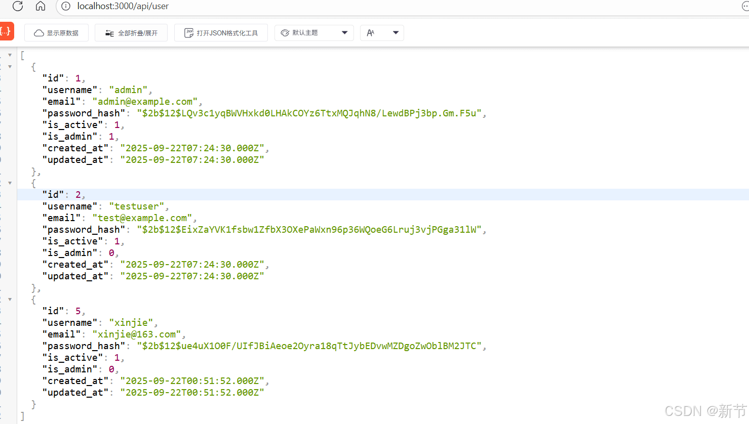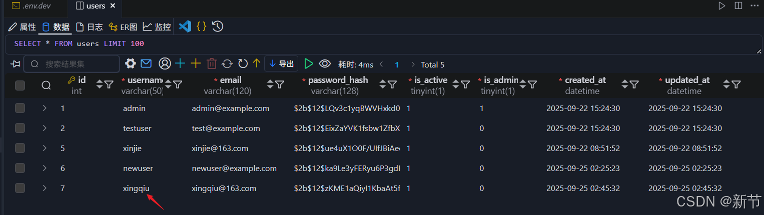 点击添加用户后,数据库会新增一条数据,如下所示。