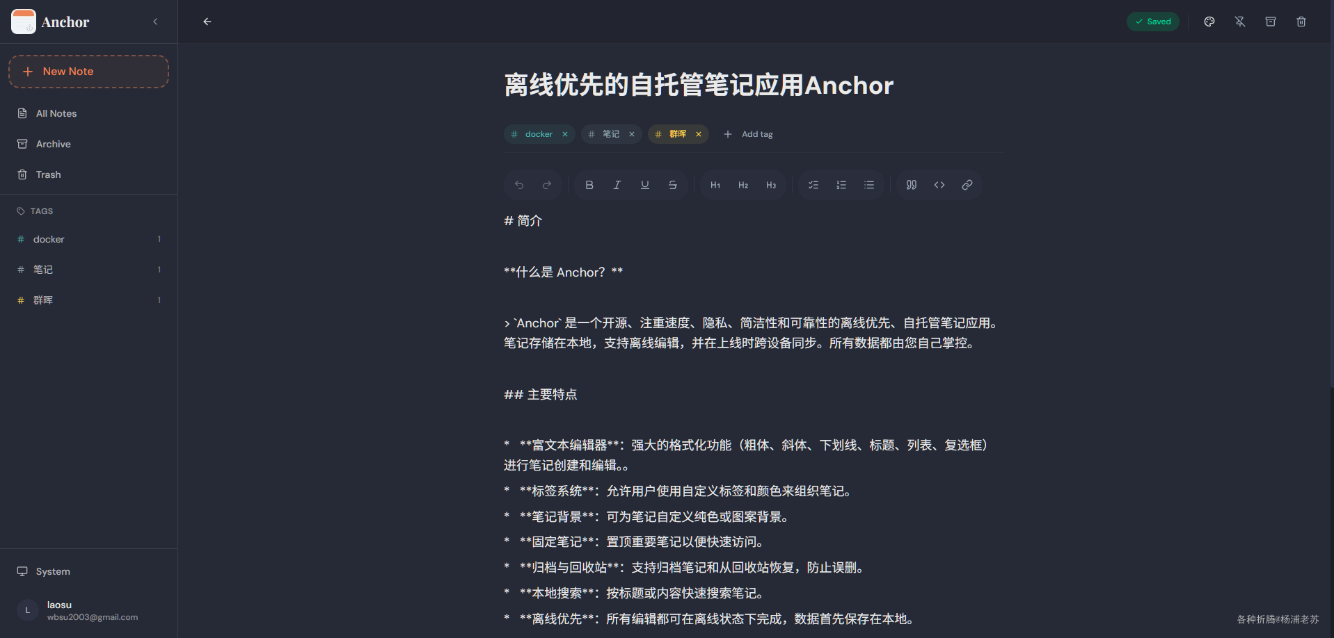Anchor 为用户提供了一个灵活、安全且个性化的笔记管理平台,适合各种场景的使用需求。
