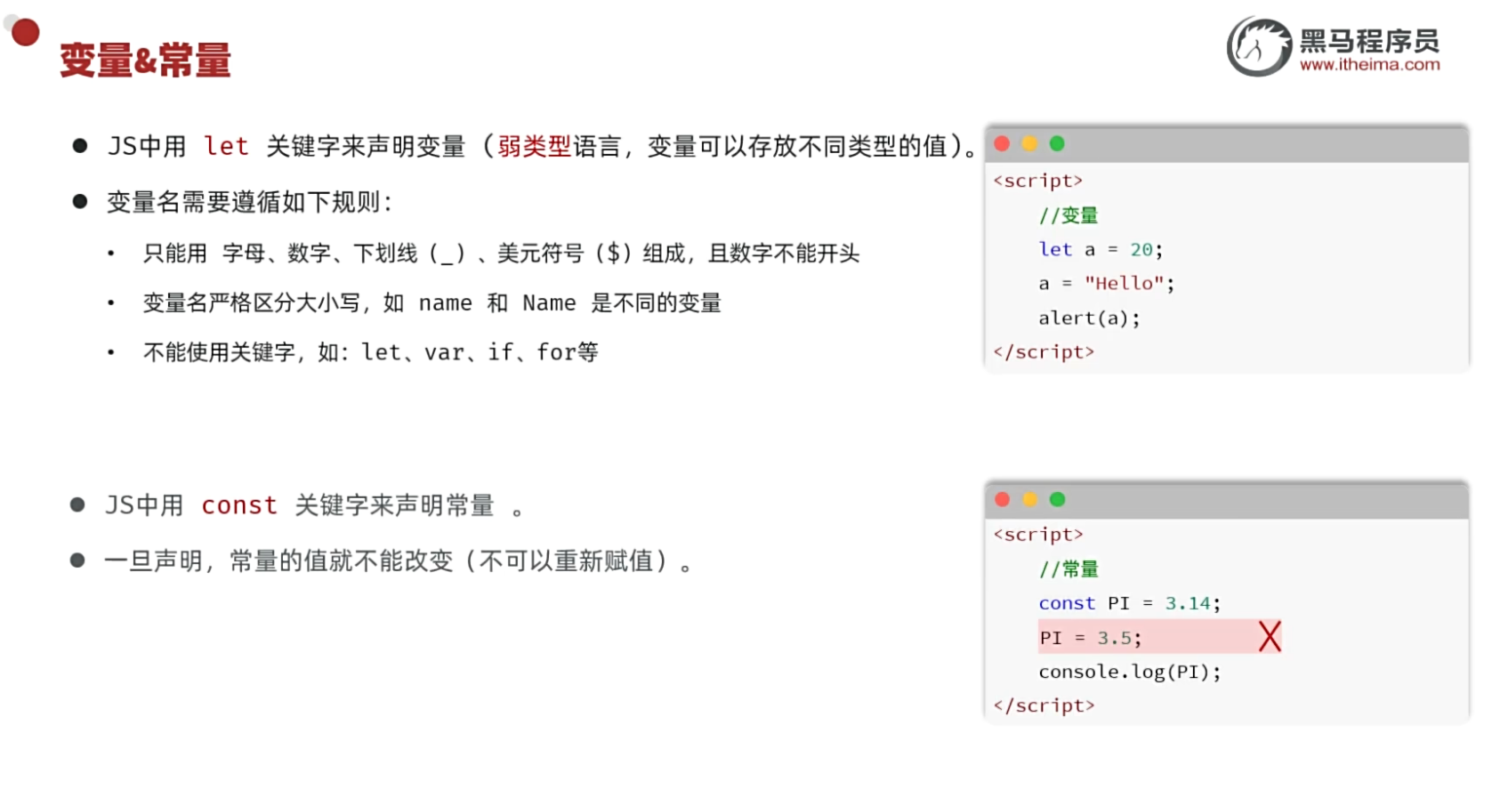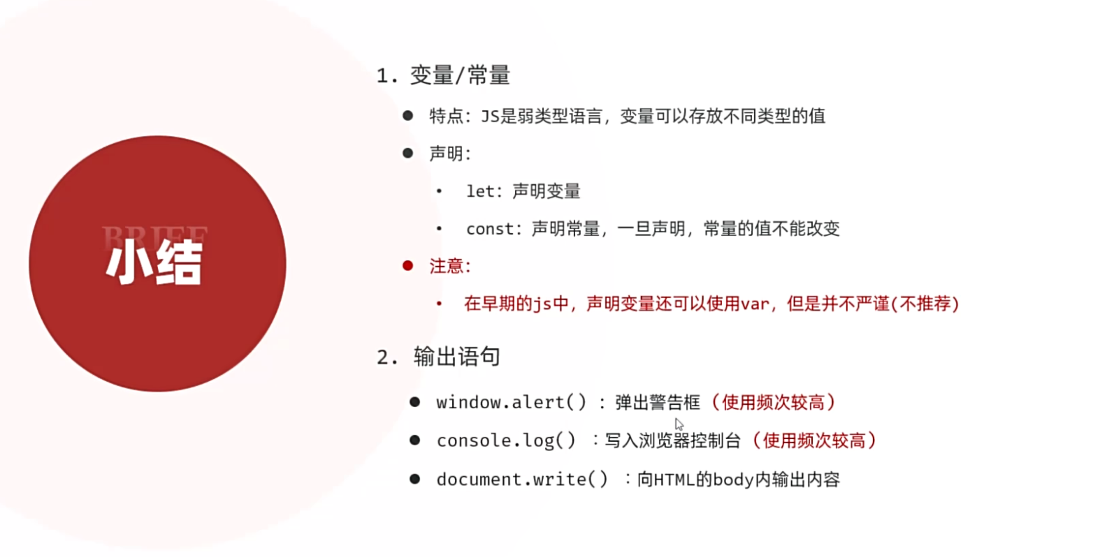 var name = "小红"; // 可以重复声明(容易出错)