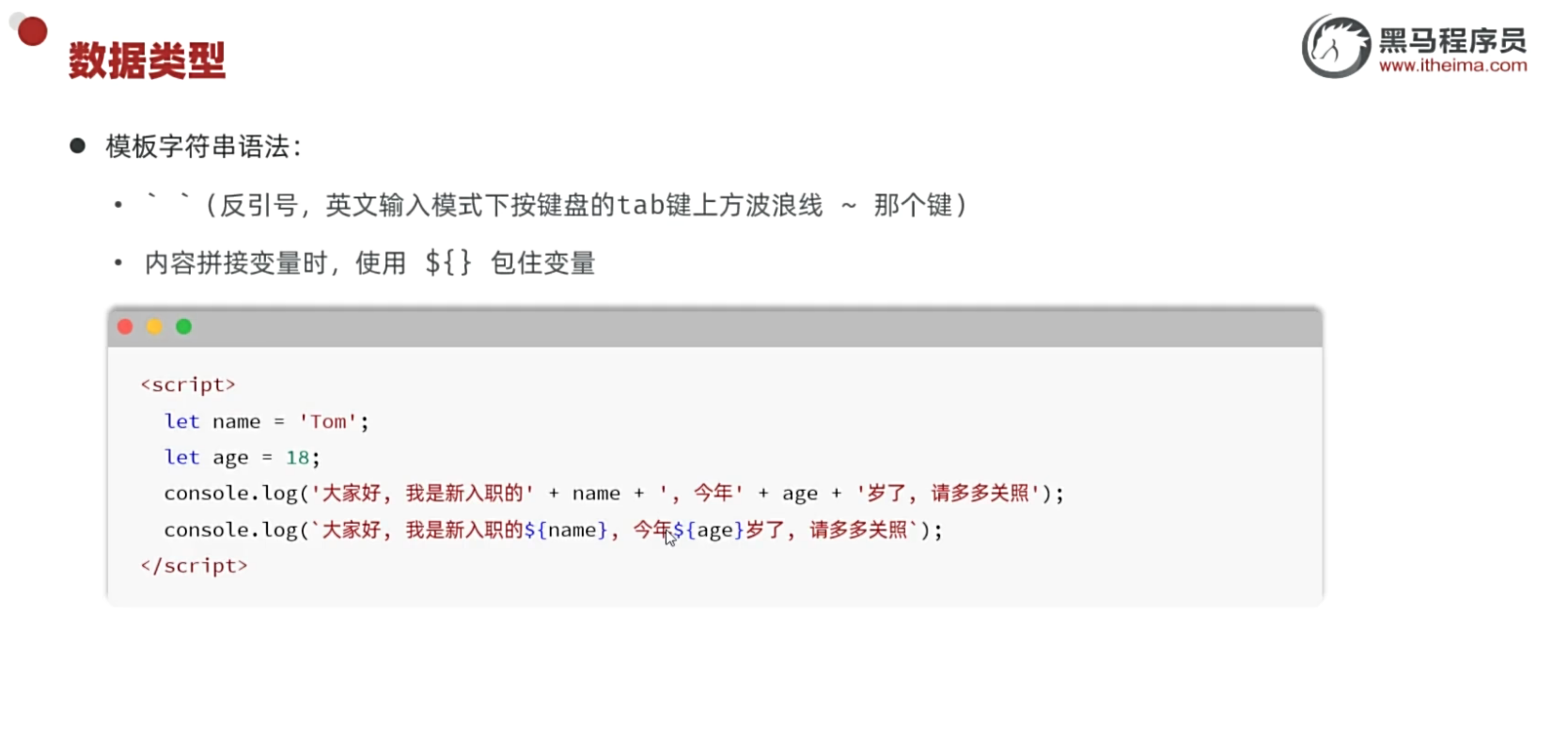 console.log(`${name}今年${age}岁`);