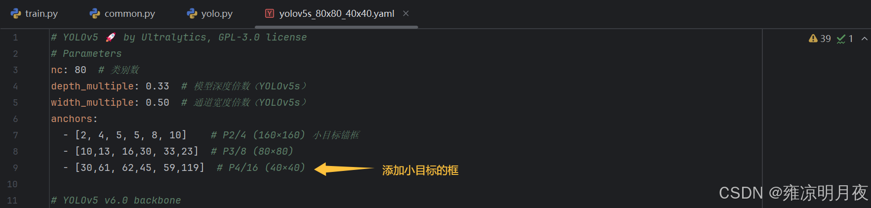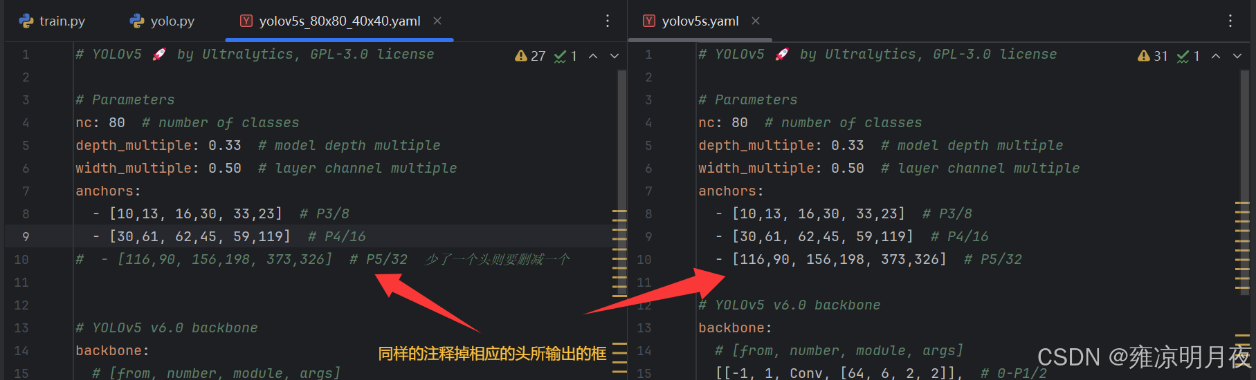 [2,4,5,5,8,10]),删除不需要的锚框组(如删除 20×20 头则删对应 P5 锚框),确保锚框组数与输出头数量一致;- 特征源确认:找到新增头对应的 backbone 特征层(160×160 对应 stride=4 的 P2/4 层);
