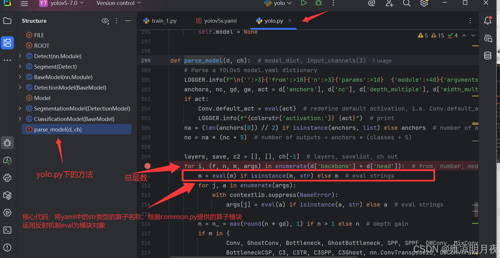 parse_model方法的核心职责是解析yaml配置文件,构建对应的网络模型结构,其中 "通过eval()方法将 yaml 中的字符串算子反射到common.py中的对象" 是其中的关键步骤反射机制 eval strings