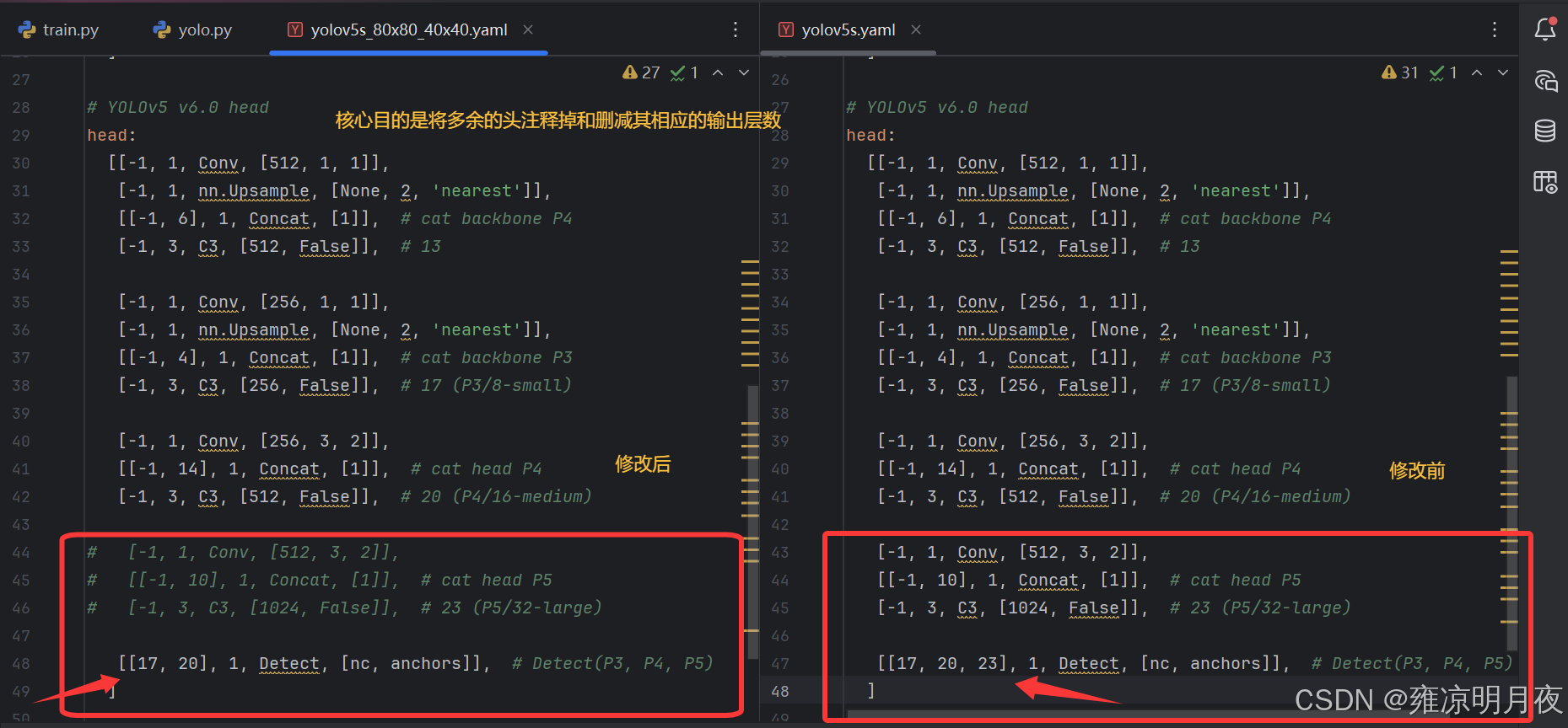- 检测头输入更新 :修改 Detect 层的输入分支索引,匹配新增 / 保留的输出头(如