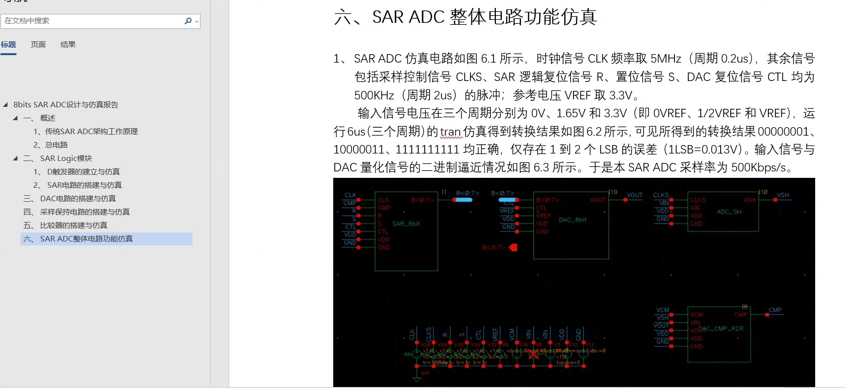 8bit逐次逼近型SAR ADC电路设计成品 入门时期的第三款sarADC,适合新手学习等。 包括电路文件和详细设计文档。 smic0.18工艺,单端结构,3.3V供电。 整体采样率500k,可实现基本的模数转换,未做动态仿真,文档内还有各模块单独仿真结果。