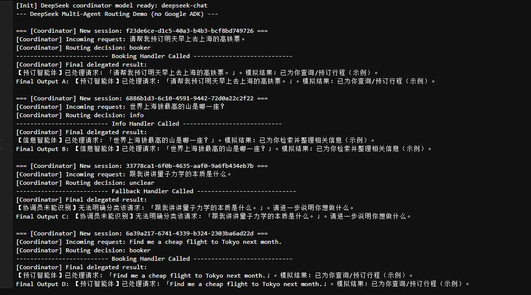 print("--- DeepSeek Multi-Agent Routing Demo (no Google ADK) ---")