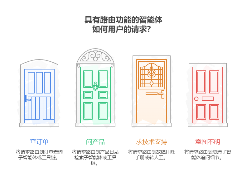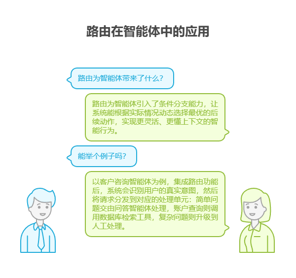 以客户咨询智能体为例。集成路由功能后,系统会先识别用户的真实意图,然后将请求分发到对应的处理单元:简单问题交由问答智能体处理,账户查询则调用数据库检索工具,复杂问题则升级到人工处理,而非采用单一的预设响应路径。