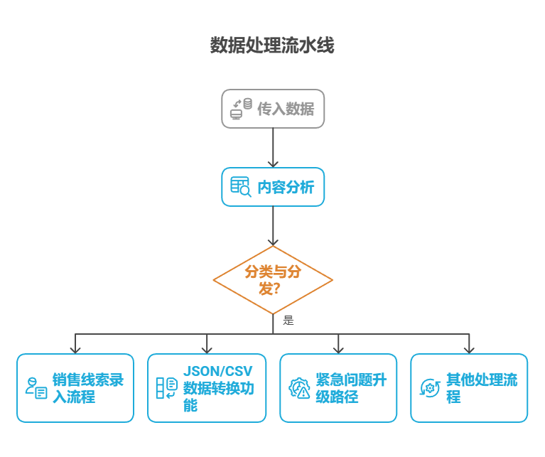 数据处理流水线:在自动化数据和文档处理流水线中,路由充当分类和分发功能。系统基于内容、元数据或格式对传入的数据(如电子邮件、支持工单或 API 负载)进行分析,然后将每项内容导向相应的工作流,例如销售线索录入流程、针对 JSON 或 CSV 格式的特定数据转换功能,或紧急问题升级路径。
