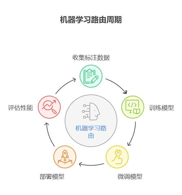 - 机器学习路由(Machine Learning Model-Based Routing):采用判别式模型(如分类器),该模型在少量标注数据上经过专门训练以执行路由任务。虽然在概念上与向量路由方法有相似之处,但其关键特征在于监督微调过程,通过调整模型参数来创建专门的路由功能。此技术与大模型路由的区别在于,其决策组件并非在推理时执行提示词的生成式模型,而是将路由逻辑编码在微调后模型的学习权重中。虽然在预处理阶段可能使用大语言模型生成合成数据以扩充训练集,但实时路由决策本身并不涉及大模型。