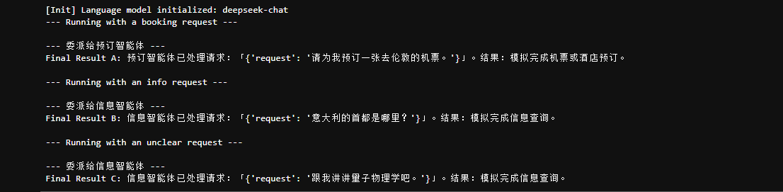以下代码演示了使用 LangChain 和 DeepSeek 生成式 AI 构建的简单类智能体系统。它设置了一个「协调员」,根据请求的意图(预订、信息查询或不明确)将用户请求路由到不同的模拟「子智能体」处理器。系统使用语言模型对请求进行分类,然后将其委派给适当的处理函数,模拟了多智能体架构中常见的基本委派模式。