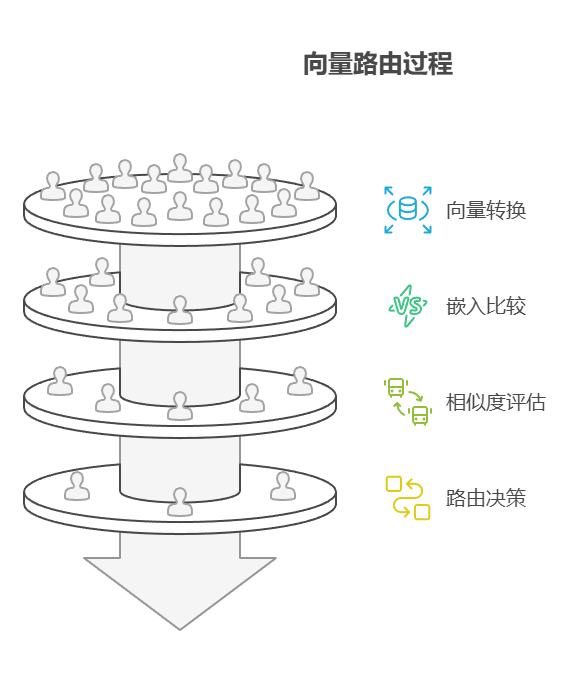 - 向量路由 (Embedding-based Routing):将输入查询转换为向量嵌入,然后与代表不同路由或能力的嵌入向量进行比较,将查询路由到嵌入相似度最高的路径。此方法适用于语义路由场景,其决策基于输入的语义含义而非仅仅关键词匹配。例如,「帮我退款」和「订单有问题想取消」虽然措辞不同,但向量距离相近,因此都会被路由到退款处理流程。