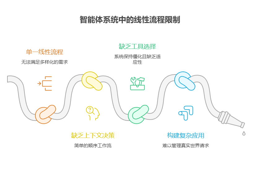 问题所在:智能体系统往往需要应对各种各样的输入和情境,单一的线性流程无法满足这一需求。简单的顺序工作流缺乏基于上下文做出决策的能力。如果没有为特定任务选择正确工具或子流程的机制,系统将保持僵化且缺乏适应性。这一局限性使得构建能够管理真实世界用户请求的复杂性和可变性的成熟应用变得困难。