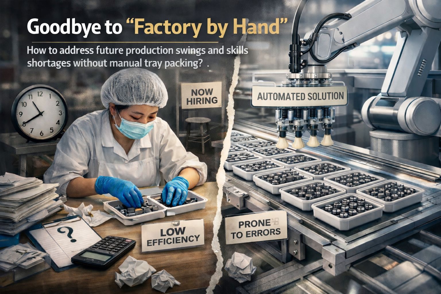 在实验室或小批量生产中,人工摆盘或许是"可为之"的方案。然而,当生产规模扩大至每日数百万件时,其底层矛盾便暴露无遗: