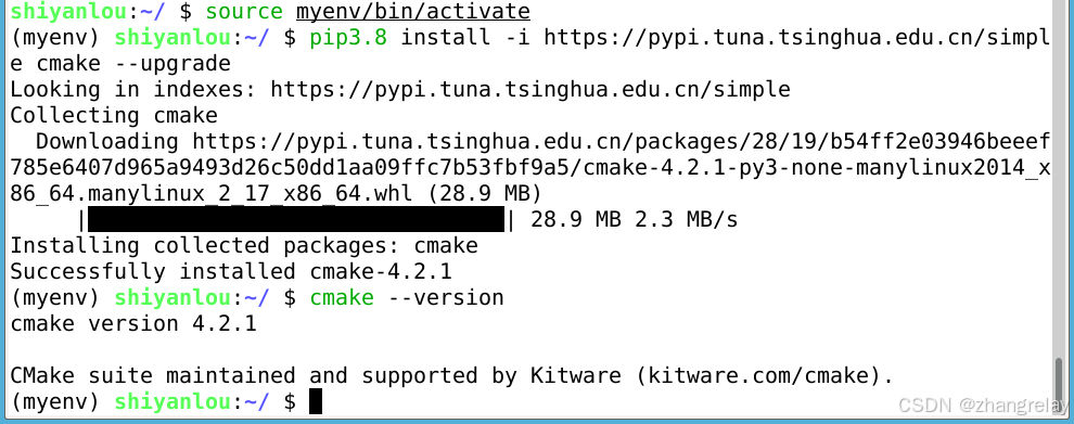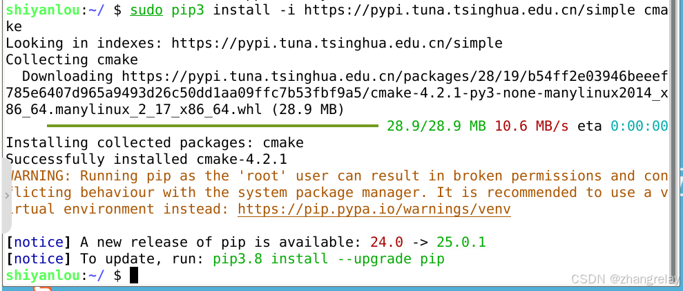 shiyanlou:~/ $ sudo pip3 install -i https://pypi.tuna.tsinghua.edu.cn/simple cmake