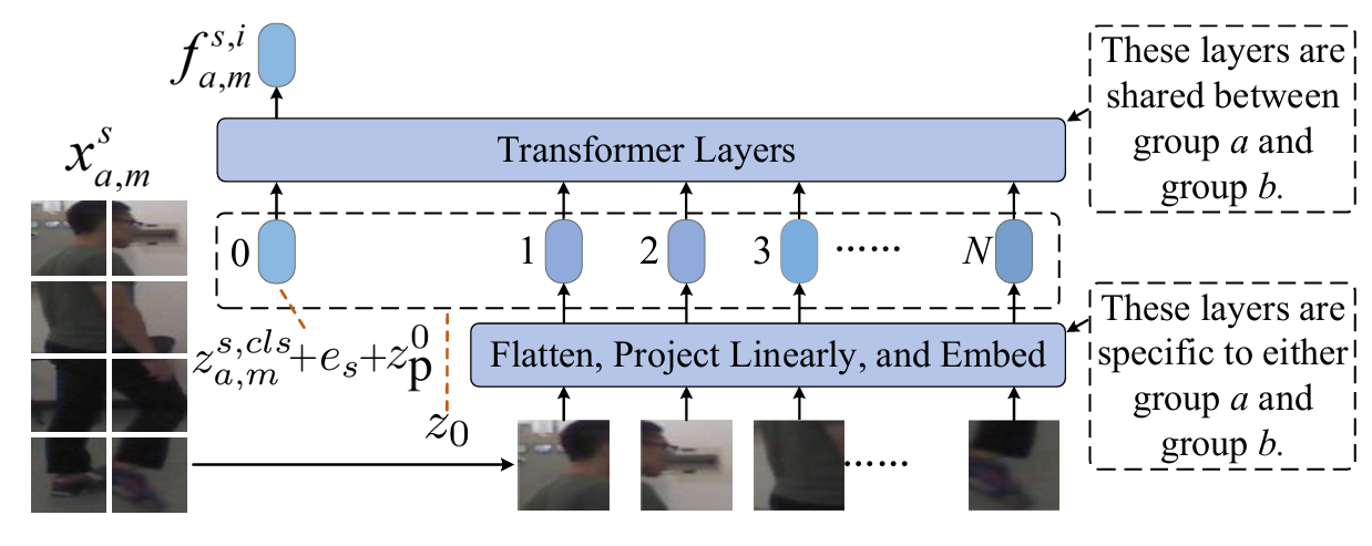 其中[zp0;⋯ ;zpN][z_{p}^{0};\cdots;z_{p}^{N}][zp0;⋯;zpN]表示位置嵌入,ese_{s}es是可学习的场景嵌入。块的展平和投影、za,ms,clsz_{a,m}^{s,cls}za,ms,cls的连接以及位置嵌入基于标准的ViT方法(Dosovitskiy et al. 2021)。场景嵌入是本文为应对我们的UMS-ReID设置而引入的。