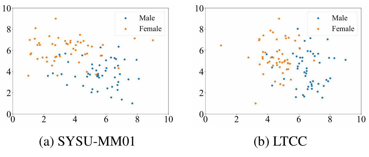 在ITKM中使用视觉语言模型的动机是利用视觉语言模型强大的表示能力,具体来说,是利用语言在更高级别语义上表示身份相关信息的能力,这些语义可能在异构组间和跨场景中保持不变。因此,我们检查了可学习的文本嵌入,以确定它们是否确实捕获了高级别的身份相关语义信息,并发现确实如此。例如,我们分别在SYSU-MM01和LTCC数据集上可视化了文本表示,如图S4所示。两种场景中的文本表示分布似乎都与性别相关。这验证了文本表示的有效性,表明它们不仅引导图像编码器适应不同场景,而且还编码了身份相关的语义信息,这有潜力促进图像编码器的身份相关学习。