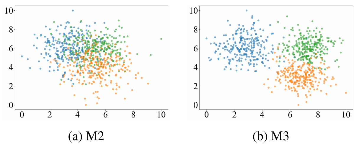 图 4: 消融方法M2和M3的文本表示的二维t-SNE(Van der Maaten and Hinton 2008)可视化。不同颜色代表来自不同场景的文本表示。