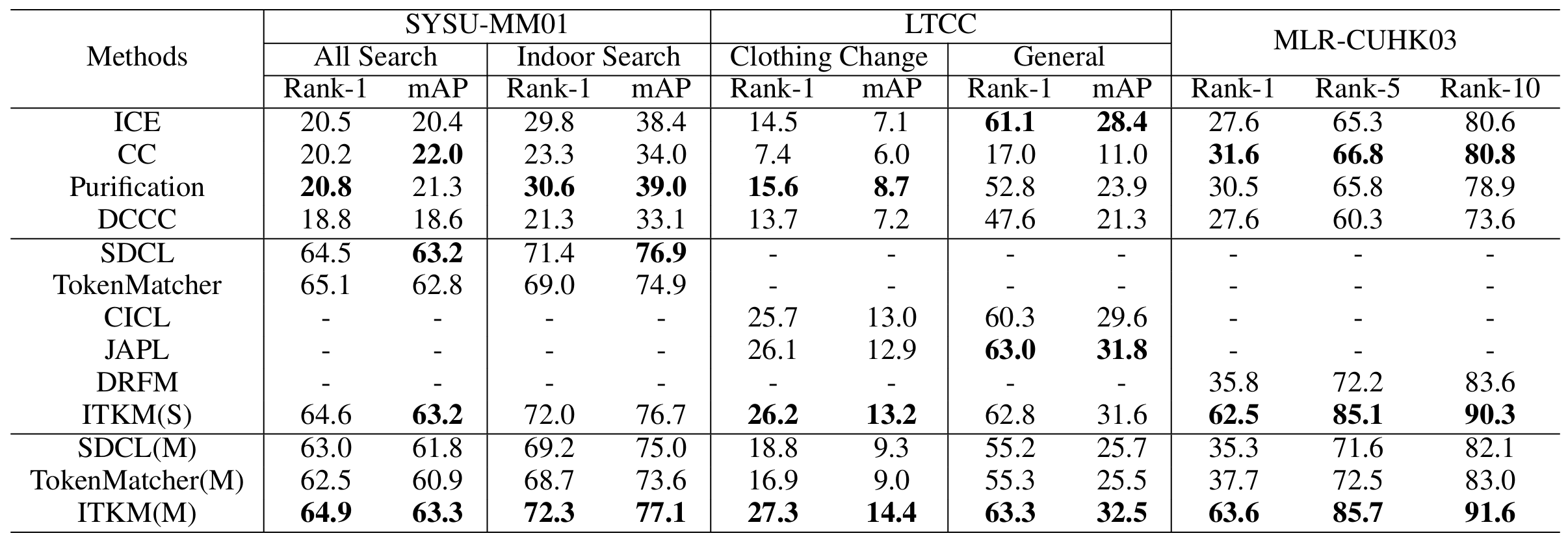 表 1: ITKM与现有方法在SYSU-MM01、LTCC和MLR-CUHK03上的比较。