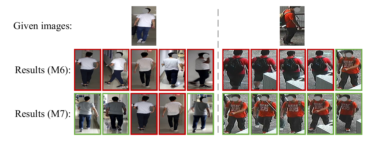 证实了在实例级获取异构正样本对的可行性。此外,我们发现M7优于M6。为了进一步探究,我们在图6中可视化了M6和M7获得的一些实例级异构正样本集。与M6相比,M7有效地排除了一些视觉上相似的假正样本。这可能是由于文本编码器和图像编码器的认知焦点不同,使得IHM能够依靠一致性避免图像编码器的某些误判。相比之下,尽管CNL也依赖一致性,具体是图像编码器的浅层和深层表示之间的一致性,但它本质上是依赖图像编码器内部的知识,难以克服图像编码器固有的局限性。这验证了IHM的有效性。