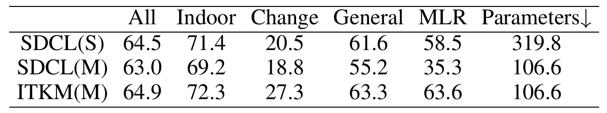 理论上,现有的无监督场景特定方法,如果分别在三个不同的场景上单独训练,并通过为每个场景选择相应的权重进行测试,也有可能获得与UMS-ReID方法类似的结果。为了验证这个想法,我们将现有的先进方法SDCL(Yang, Chen, and Ye 2024)分别在三个场景上单独训练,并在各自的场景上测试得到的三个模型。我们将这三个模型称为SDCL(S)。如表S1所示,SDCL(S)的性能不仅落后于ITKM(M)的性能,而且在测试阶段所需的参数数量(109)(10^{9})(109)是ITKM(M)的三倍。这是因为ITKM(M)能够将所有三个场景的知识整合到一个单一模型中。这些结果不仅证明了所提出方法的优越性,也确认了UMS-ReID的研究价值。